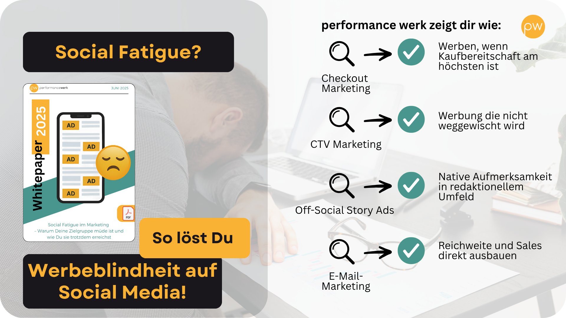 Wir bei Performance Werk setzen auf einen crossmedialen Ansatz, der dort wirkt, wo klassische Ads scheitern: nach dem Kauf, auf dem großen Screen, im redaktionellen Kontext und im Postfach.